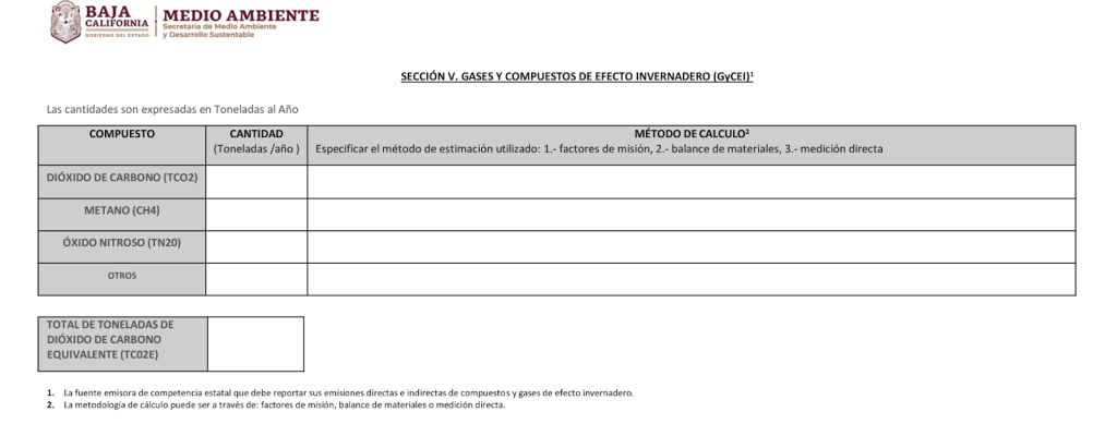 Ahora, es un requisito indispensable reportar la cantidad de GEI generados (expresada en toneladas al año), especificando el método de cálculo – ya sea por factores de emisión, balance de materiales o medición directa e indicar el resultado final de la sumatoria de los compuestos y gases en toneladas de dióxido de carbono equivalente (tCO2e).